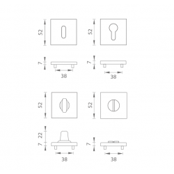 Hranatá rozeta je vyrobená z materiálov vysokej kvality - zamak a je povrchovo upravená. Rozeta má rozmery 52 x 52 mm, hrúbku 7 mm a oválny otvor pre interiérový kľúč (BB), otvor pre cylindrickú vložku (PZ), WC set s vmontovaným kľúčom. Balenie obsahuje 2 kusy roziet (pár) a rozety WC sú v balení ak..